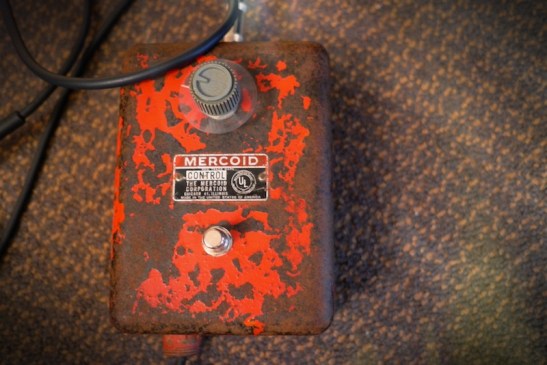 The Merc is the shell of an old industrial thermostat. We have carefully removed the toxic substances and fused it with the insides of a crybaby wah, then replaced the foot pedal with a knob filter switch. It is now like the superhero of guitar pedals, mysteriously stronger after the accidental radiation exposure.